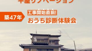 \平屋モデルハウス工事開始直前!おうち診断体験会/ 築47年!岩水寺にある住宅で、モデルハウスの工事開始直前におうち診断の体験会を開催します! 完全予約制 開催日:11月8日(土)、9日(日) 開催時間:10:00~17 … 続きを読む 平屋モデルハウスin岩水寺 おうち診断体験会